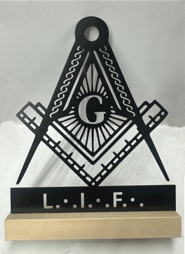adorno sobremesa metalico con base en madera con las iniciales de la masoneria libertad igualdad fraternidad