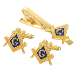 juego de Pisacorbata, gemelos y pin con acacia, baño de oro, y esmaltado al fuego compas y escuadra