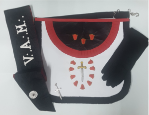 conjunto completo Iº Ord.·. , R.·.F.·. Moare , bordado. incluye Mandil, Banda, joya y guantes negros