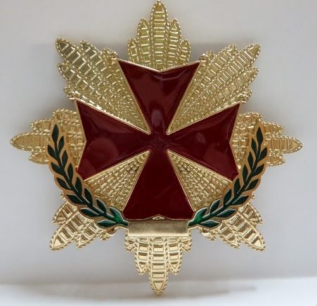 AGOTADA. Condecoración Templaria cruz Pate con acacia Medalla condecoracion – bañado en oro y esmaltada al fuego medidas 8,5 x 8,5 con Alfiler trasero para sujecion