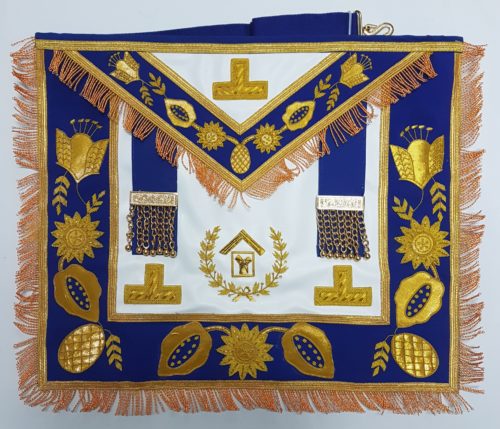 MANDIL GRAN PASADO MAESTRO DE LA GRAN LOGIA, PASADO VENERABLE MAESTRO, BORDADO A MANO EN HILO DE ORO EN MOARE